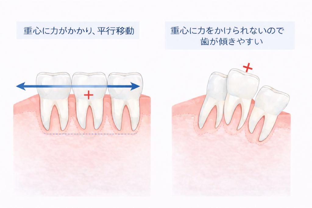 もし、歯の重心を上手く押すことができるなら、歯は傾くことなく並行にスムーズに動きます。