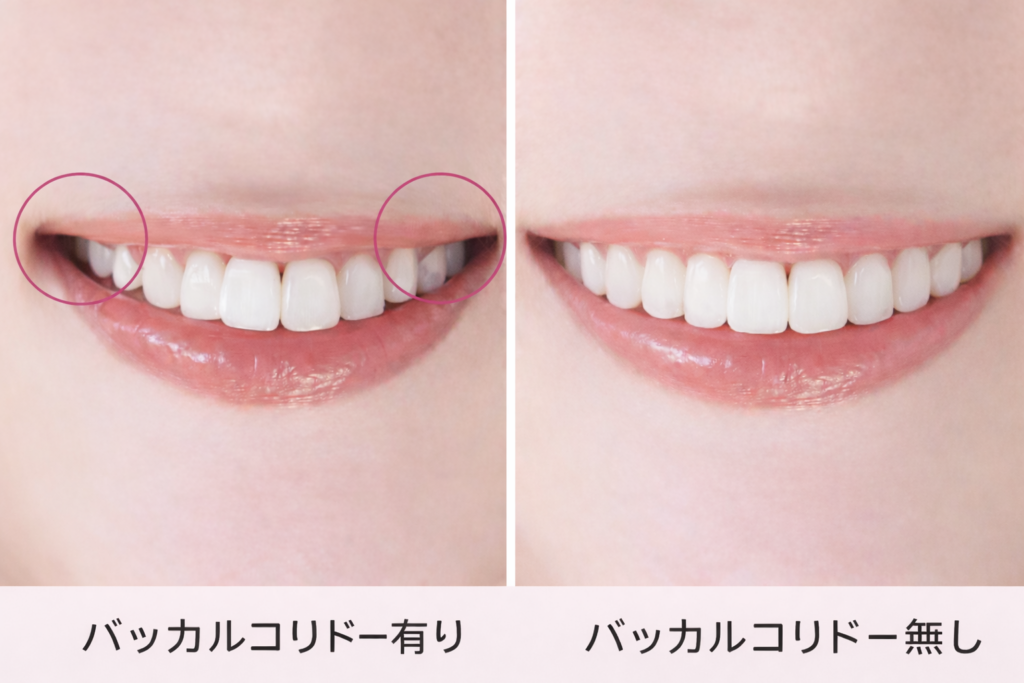 バッカルコリドーとは、笑ったときに歯と口角に出来る、影や隙間の部分(ブラックスペース)のことです。