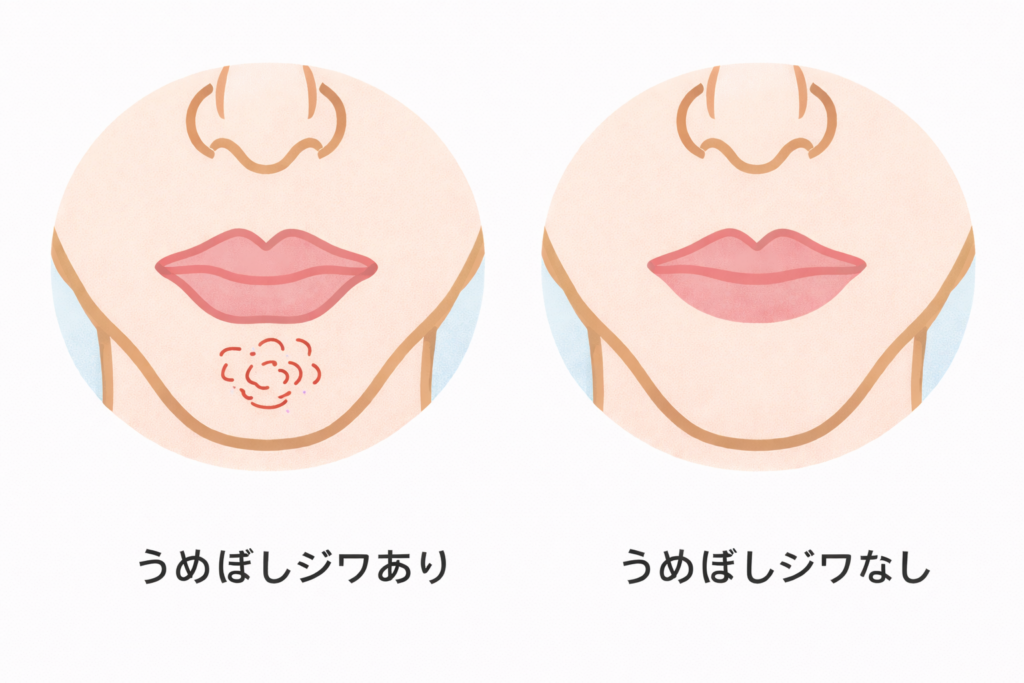 上の前歯を引っ込めると、上唇も後ろに下がり、唇が閉じやすくなります。すると、今まで、無理をして下唇を巻き込むように唇を閉じる必要がなくなるので、下唇の緊張がほどけ、オトガイ筋の緊張もほどけてきます。オトガイ筋が緊張がなくなることで、梅干しジワが消えます。ボトックスをつかったシワ取りは約3ヶ月ほどで効果が消えますが、上の前歯の突出が原因でオトガイ筋が緊張した梅干しジワでは、根本的な治療になります。