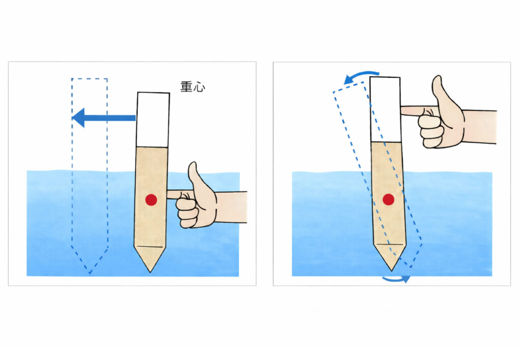 歯に限らず、全ての物体には重心があります。この重心を的確に押すことで歯を並行に動かすことができます。たとえば、下の絵のように、水の中に杭が刺さっているとします。水の抵抗は強いですが、空気の抵抗は弱いです。この時、杭の重心は水の中にあり、この重心を押すと、並行に杭を動かすことができます。一方で、重心でなく、水の外に出てる杭の部分を押すと、杭が倒れてしまいます。(プールに半身がつかっているイメージだと体感で想像しやすいです。)